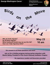 It's spring migration! Go birding with an expert from the Ozark Gateway Audubon Chapter. No experience needed, binoculars available.